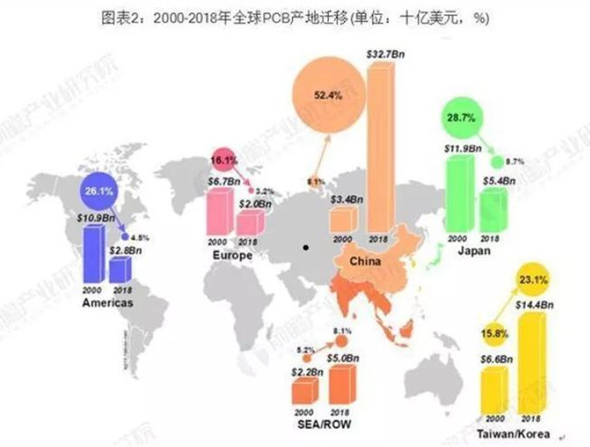 中国作为全球PCB行业的最大生产国,占全球PCB行业总产值的比例已由2000年的8.1%上升至2018年的52.4%,美洲、欧洲和日本的产值占比大幅下滑,中国大陆和亚洲其他地区(主要是韩国、中国台湾和东南亚)等地PCB行业发展较快。