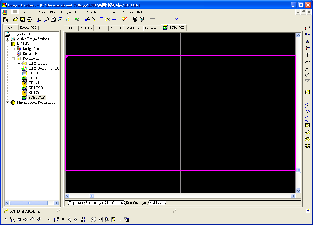 双击新命名之PCB档,进入PCB布线画面,先点选画面下方之KeepOutLayer页面标籤,再用画面右侧之绘图线画出边框线,如图14。画面一样用PageUp或PageDown调整至适合大小做绘图。