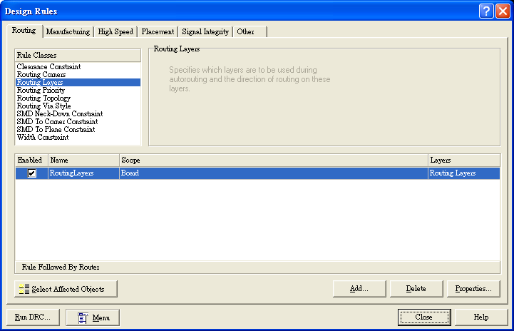 因列举电路不是很複杂关系,所以我们用单面版就可以布线完成,而通常PROTEL里预设版面是以双面来进行布线,所以我们要选择成单面布线。选择上方主目录中Design→Rules出现对话框后,选到Routing Layers后,进入右下角的设定Properties,如图18。